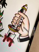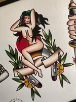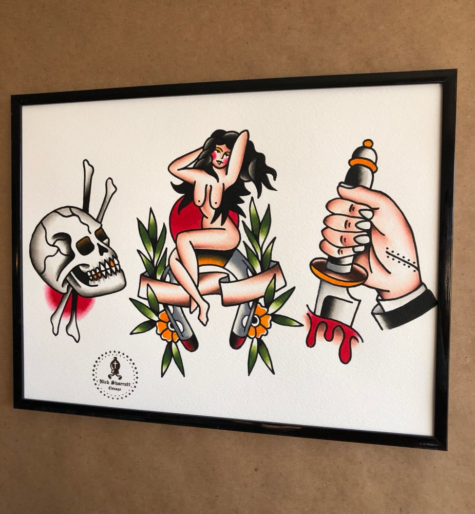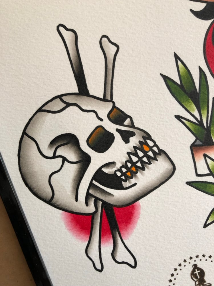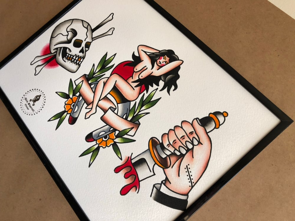 This painting, along with five other 9x12’s have hung on the walls of Fudo Tattoo since the shop opened in September of 2018, and stayed in Nick’s station until December of 2025, when they decided they needed a new home.