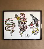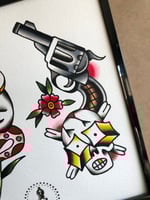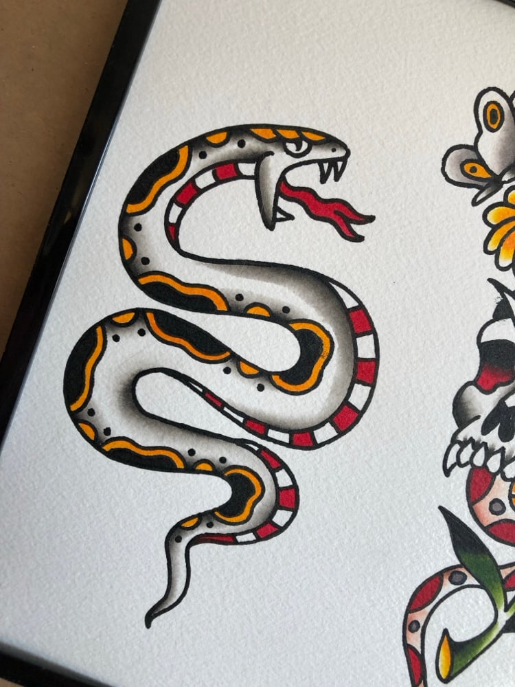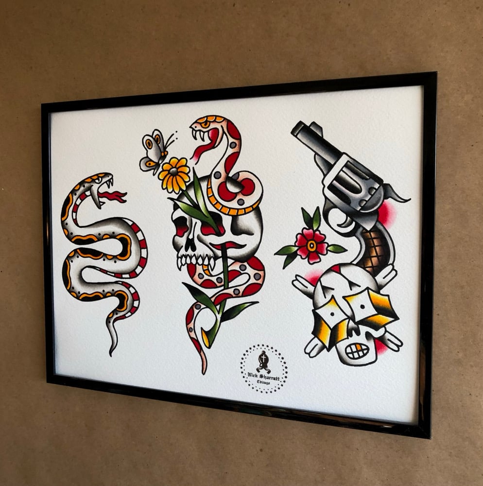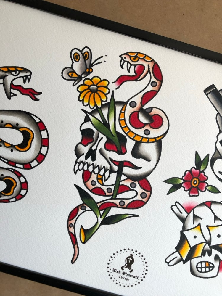 This painting, along with five other 9x12’s have hung on the walls of Fudo Tattoo since the shop opened in September of 2018, and stayed in Nick’s station until December of 2025, when they decided they needed a new home.